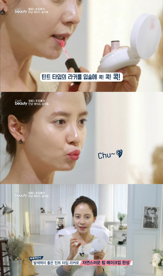 송지효는 지난 10일 방송된 온스타일 겟잇뷰티 '토킹미러' 코너에 출연해 평소 즐겨 쓰는 잇 아이템을 공개했다. 공항 패션과 어울리는 내추럴한 메이크업과 메이크업 팁에 대해 자세히 소개해 눈길을 끌었다.
