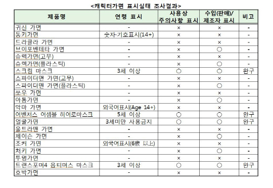 소비자원은 최근 시중에 유통중인 '캐릭터 가면' 21개 제품을 대상으로 안전성, 사용 연령 표시실태를 조사한 결과를 토대로 주의를 당부했다.