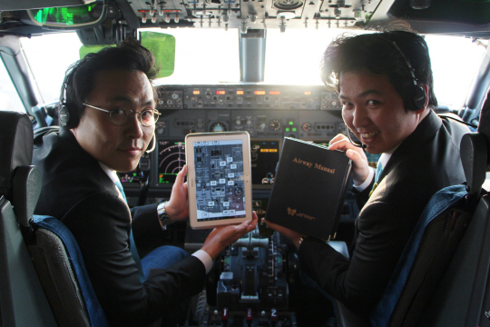 진에어(대표 마원)가 17일 항공기 조종에 필요한 각종 서류와 책자를 태블릿 PC에 담아 운용하는 '종이 없는 조종실' 구현에 나선다고 밝혔다. 종이 없는 조종실은 국내 전 항공사 최초다.