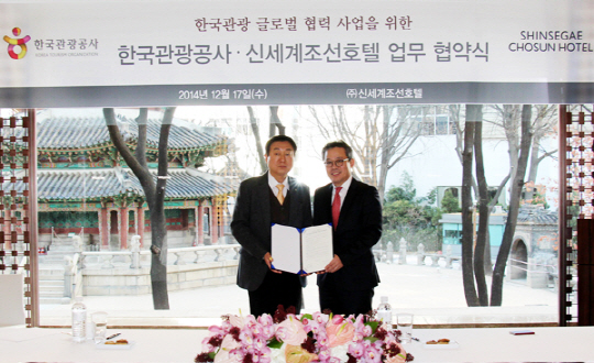 | align='left" bgcolor='#ffffff" class='caption'>신세계조선호텔과 한국관광공사는 17일 한국관광 글로벌 협력사업'을 위한 업무협조약정을 체결했다. 사진 왼쪽부터 한국관광공사 이재성 본부장, 신세계조선호텔 이규원 상무. |
