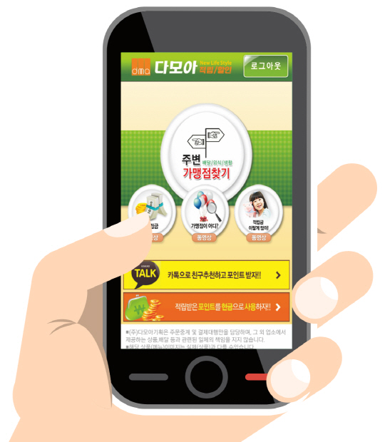 또한 다모아기획은 홈페이지와 어플리케이션을 이용해 온라인 광고효과를 지원하고 있다. 스마트폰만 있으면, 회원은 언제 어디서나 원하는 지역과 업종별로 가맹점의 정보와 위치를 실시간으로 확인이 가능하다. 아울러 홈페이지를 통해 회원들에게 정보제공은 물론, 어플리케이션을 통해 약속잡기, 동영상광고, 배달주문하기 등 회원들과 가맹점의 편의를 극대화 할 수 있는 다양한 기능들도 서비스한다. 포인트의 적립내용 역시 실시간으로 확인 가능하며 회원이 자신의 스마트폰을 이용, 직접 포인트를 현금으로 즉시 환전이 가능하다. 가맹점의 혜택으로는 홈페이지, 어플리케이션, 포인트 카드, 오프라인행사를 통해 가맹점 가입만으로도 다양한 광고 혜택을 누릴 수가 있으며, 가맹점 또한 소비자와 같이 모든 혜택을 받을 수 있다. 1566-6041