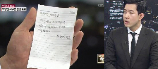 박창진 사무장은 17일 KBS1 뉴스라인 스튜디오에 직접 나와 조 전 부사장이 자신의 집 문틈에 남기고 간 사과 쪽지를 공개했다.