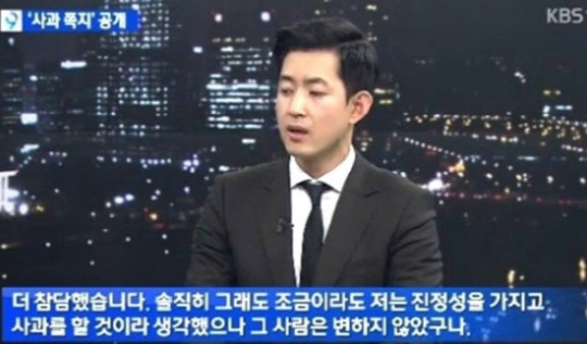 한편 박창진 사무장은 17일 KBS1 뉴스라인 스튜디오에 직접 나와 조 전 부사장이 자신의 집 문틈에 남기고 간 사과 쪽지를 공개하며 "진정성을 가지고 사과할 것이라 생각했으나 전혀 준비된 사과가 아니었고, 한줄 한줄에 저를 배려하는 진정성은 없었다"는 심경을 전했다. <스포츠조선닷컴>
