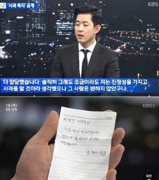 박창진 사무장은 17일 KBS1 뉴스라인 스튜디오에 직접 나와 조 전 부사장이 자신의 집 문틈에 남기고 간 사과 쪽지를 공개했다.