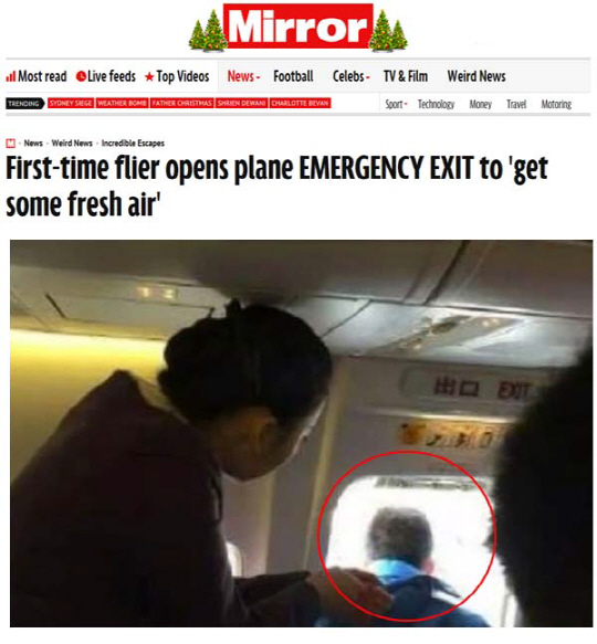 비행기를 처음 탄 남성 승객이 이륙전 신선한 공기를 마시고 싶다며 비상구쪽으로 향했다. 놀란 승무원이 제지하려 했지만 그는 이미 비상구에 달린 개폐기를 열어젖혔다.