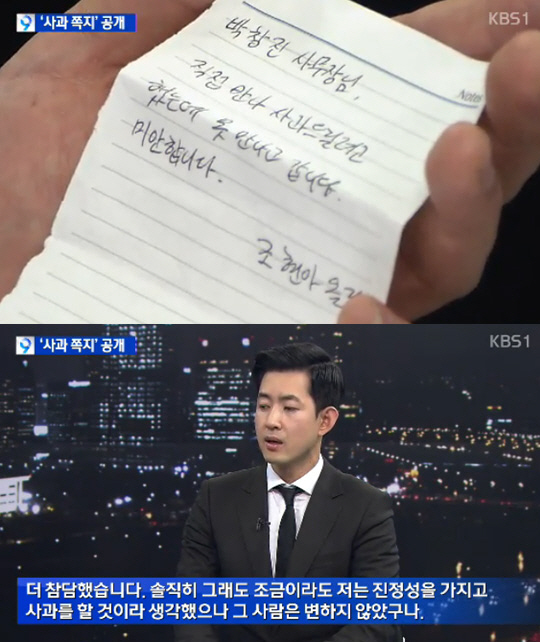 박창진 사무장은 17일 KBS1 뉴스라인 스튜디오에 직접 나와 조 전 부사장이 자신의 집 문틈에 남기고 간 사과 쪽지를 공개했다.