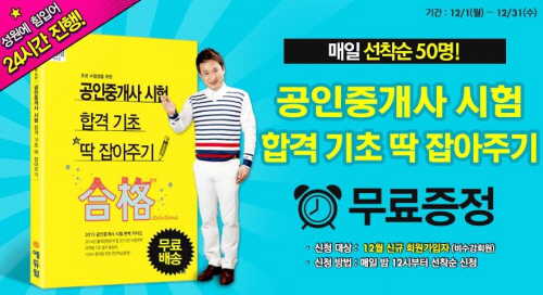 공인중개사 자격증이나 주택관리사 자격증 취득을 준비하는 수험생이라면 누구나 신청할 수 있으며, 공인중개사는 매일 선착순 50명에 한해 그리고, 주택관리사는 선착순 30명까지 '합격기초 딱 잡아주기' 무료증정 혜택을 받을 수 있다. 배송비는 무료이며, 자세한 사항은 에듀윌 홈페이지를 참조하면 된다.