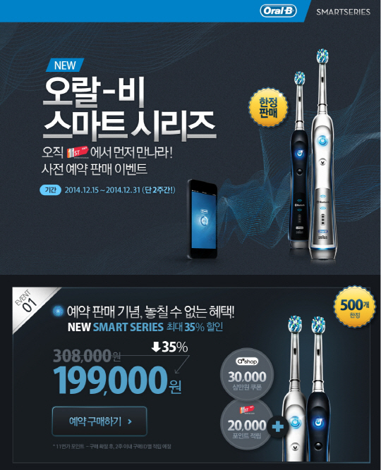 2015년 1월 1일 출시 예정인 오랄비 스마트 시리즈 화이트&블랙은 세계 최초 블루투스를 탑재하고 사물인터넷 기술을 적용한 제품으로 오랄비의 역사상 가장 지능적인 전동칫솔이다. 이번 예약 판매는 선착순 500개 한정으로 진행된다. 기간 중 예약 구매하는 경우 최대 35% 할인되며 11번가 2만 포인트 적립이 함께 제공된다.