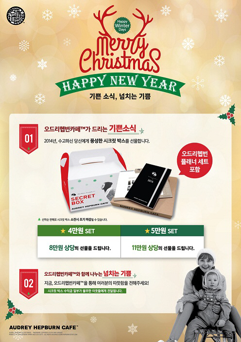 오드리헵번 카페(대표 김석훈)가 22일부터 '기쁜 소식, 넘치는 기쁨' 시크릿 박스 판매 이벤트를 진행한다. 4만원과 5만원에 판매 될 시크릿 박스는 플래너 세트(다이어리, 탁상캘린더)와 오드리헵번 카페만의 고급스러운 MD 제품들로 구성돼 있다. 오드리헵번 카페를 사랑해 주는 고객들에게 기쁜 소식을 전하고자 기획된 이번 이벤트는 실 판매가 보다 50% 저렴한 금액으로 진행된다.