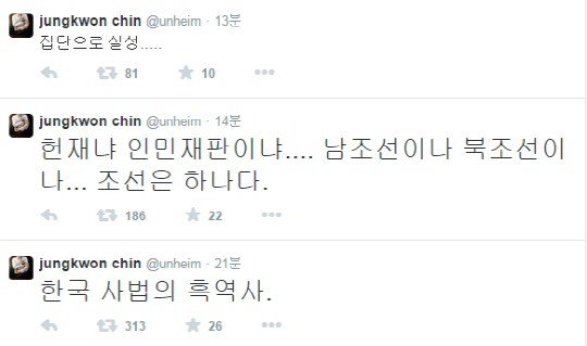 진중권 교수는 헌재 발표가 나온 19일 오전 자신의 트위터에 "한국 사법의 흑역사"라며 "헌재냐 인민재판이냐.... 남조선이나 북조선이나... 조선은 하나다. 집단 실성"이라고 맹비난했다.