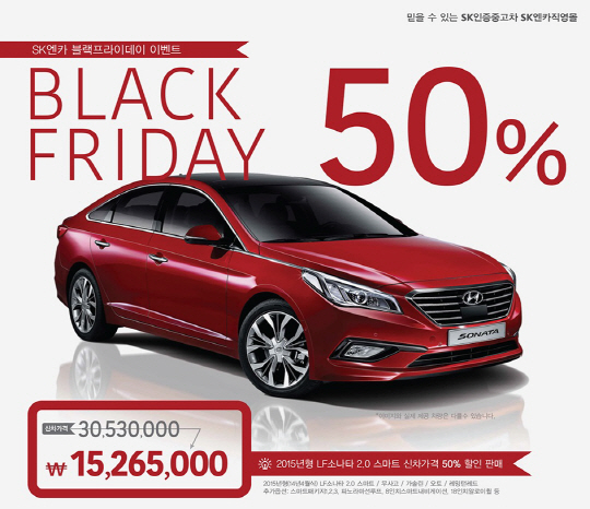 중고차 전문기업 SK엔카는 연말을 맞아 현대 LF쏘나타를 신차가의 50%인 1526만5000원에 할인 판매하는 이벤트를 오는 24일까지 실시한다고 19일 밝혔다.
