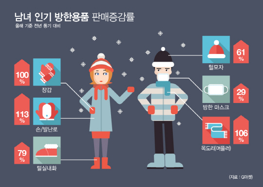 G마켓 패션실 이유영 팀장은 "12월 들어 폭설과 한파가 지속되면서 방한용품 수요가 전체적으로 증가하고 있지만 남녀 성별에 따라 선호하는 제품에 차이가 있는 것으로 나타났다"며 "여성보다 머리카락이 짧은 남성의 경우 상대적으로 얼굴과 목 부위에 추위를 더 느끼는 등 남녀의 옷차림이나 신체 특성이 반영된 결과로 해석 할 수 있다"고 말했다. 송진현 기자 jhsong@sportschosun.com