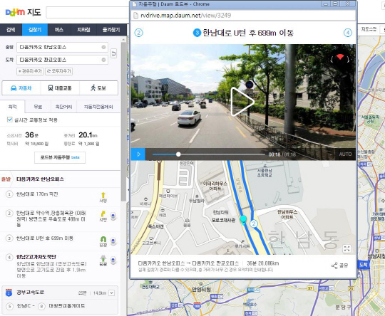 다음카카오(공동대표 최세훈, 이석우)가 다음 지도와 연계, 이색 길찾기 기능을 추가했다. 22일 다음카카오에 따르면 단순한 지도에서 벗어나 목적지까지 찾아가는 길의 생생한 모습을 자동주행 화면으로 미리 익힐 수 있도록 로드뷰 자동주행 기능을 선보인다. 로드뷰 자동주행은 다음 지도의 실시간 길찾기와 360도 파노라마 로드뷰를 연계한 서비스다. 예상 주행 구간의 로드뷰 이미지를 연속으로 이어 붙여 영상으로 제공한다.