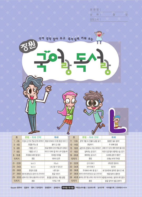 이 회사 교재개발 연구소의 안효빈 팀장은 "장원 국어랑독서랑 L과정은 올바른 문장 구성과 자신의 생각을 논리적으로 표현하는 능력 향상에 초점을 맞추어 개발됐다. 의미단위 묶어 읽기로 빠르게 읽고 정확하게 이해하는 고속정독훈련, 학생 수준에 맞는 등급별 어휘학습, 직역풀이를 적용한 어휘력 확장, 문법 학습과 전략적 독해훈련 등이 특징이다"고 밝혔다.