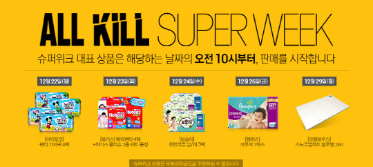 먼저 매일 오전 10시에 선보이는 일일특가 코너를 통해 23일 '하기스 매직팬티 4팩'(4만5900원), 24일 '보솜이 천연코튼 남/여 3팩(3만4900원)', '일동후디스 프리미엄 산양분유 3캔(12만9900원)', 26일 '팸퍼스 크루저 1박스(4만6900원)', '매일 앱솔루트 명작 3캔(5만1900원, 바이어쿠폰 이용시 추가 할인)', 29일 '크림하우스 스노우팔레트 블루탭 260'(12만9000원) 등이 판매된다. 행사 기간 동안 올킬 특가 상품과 함께 해당 카테고리 내 인기상품을 할인 판매한다. 물티슈의 경우 23일 '하기스 프리미어 플러스 캡', 24일에는 '비야비야 오리지날 캡', 26일에는 '보령 닥터아토 내추럴 물티슈-콧물티슈-눈가티슈'를 최저가 수준으로 판매하며 아기과자는 23일, '해피베이비퍼프'를 4,500원에 판매한다
