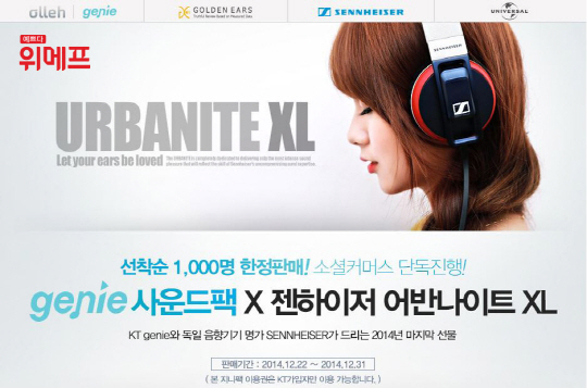 소셜커머스 위메프(대표 박은상, www.wemakeprice.com) 는 KT(회장 황창규, www.kt.com)과 손잡고 지니팩 1년 이용권과 프리미엄 헤드폰 '젠하이저 어반나이트 XL'을 결합한 '지니 사운드팩'상품을 소셜커머스 단독으로 판매한다고 23일 밝혔다.