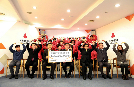 한국타이어가 연말연시를 맞아 '희망 2015 나눔 캠페인'을 주관하는 사회복지공동모금회에 소외계층 지원을 위한 이웃사랑 성금 10억 6000만원을 전달했다.