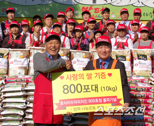 '호식이두마리치킨'은 지난 10월 28일에도 800호 가맹점 돌파를 기념해 청량리 밥퍼나눔운동본부와 함께 전 임직원이 하나되어 '호식이두마리치킨과 함께하는 사랑나눔봉사' 기념행사를 펼쳤다. 이 행사를 통해 '호식이두마리치킨'은 사랑의 쌀 800포와 1,000여명 분의 치킨, 사랑의 모자 1,000개 등을 소외계층 이웃들과 나누며 온정을 베풀었다. 최호식 회장은 "800호점 돌파를 계기로 상생의 의미를 다시 한 번 돌아보고, 그동안 받았던 사랑을 돌려드리며 모든 이들과 기쁨을 공유할 수 있는 뜻 깊은 자리였다"고 전했다.