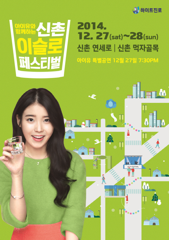 아이유의 '미니콘서트'도 놓쳐서는 안될 메인 이벤트다. 맑은 목소리의 편곡이 돋보이는 아이유의 CM송이 담긴 참이슬 영상광고가 25일부터 IPTV와 극장을 통해 방영되고 있는 가운데 열리는 아이유의 특별 공연은 27일 오후 7시부터 진행된다. 공연 이후 아이유는 연말을 맞아 바쁜 일정을 소화하고 있는 근황토크를 시작으로 아이유가 직접 경험했던 술자리 에피소드를 나누며 신촌을 찾은 고객들과 즐거운 시간을 가질 예정이다. 또한, 이슬로 페스티벌이 열리는 양일간 아프로디노와 18gram 등 다수의 유명 버스커들이 총 집합해 연말, 신촌을 뜨겁게 달군다.