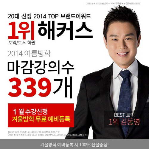 최근 해커스어학원이 대학내일 20대 연구소에서 발표한 '2014년 20대에게 사랑받은 15개 브랜드-토익ㆍ토익스피킹 학원 분야 TOP BRAND'에서 1위 선정 후 겨울방학 수강신청 신청자들이 해커스에 큰 관심을 보이고 있다.