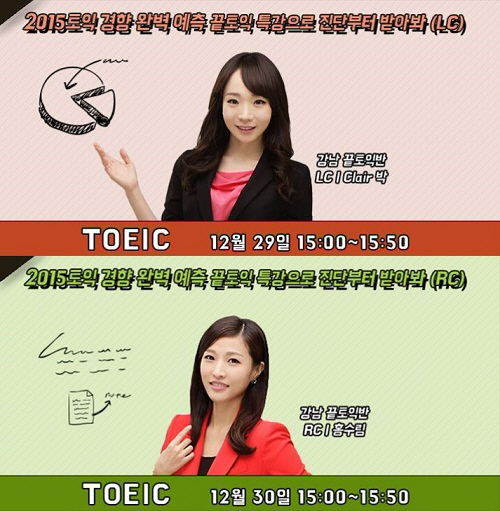 끝토익 팀의 클레어 박 강사와 홍수림 강사는 각각 토익 평균 150~350점 상승을 가능케 하는 LC, RC 강의 노하우를 공개예정이다. 토익 수험생은 본인 실력을 진단 받을 수 있고 진단 후에는 LC 또는 RC 영역 별로 개별 맞춤 상담도 이뤄진다.