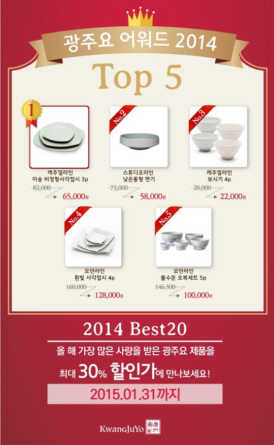 생활 속의 명품 ㈜광주요(대표 조태권)가 2014년 가장 사랑 받은 제품을 선정하는 '광주요 어워드 2014'를 통해 최고 인기 제품 'Top 5'를 발표하고, 2015년 1월 말까지 최대 30% 할인하는 '베스트 20' 행사를 진행한다.