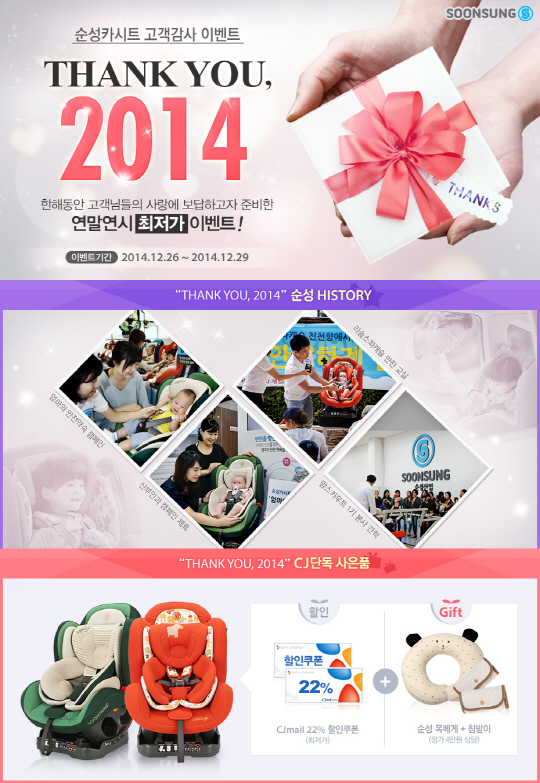 유아용 카시트 전문기업 ㈜순성산업(대표 이덕삼 www.soonsung.com)은 26일부터 4일 간 온라인 종합쇼핑몰 CJ몰에서 연말맞이 고객 감사 이벤트로 'THANK YOU, 2014' 기획전을 진행한다.