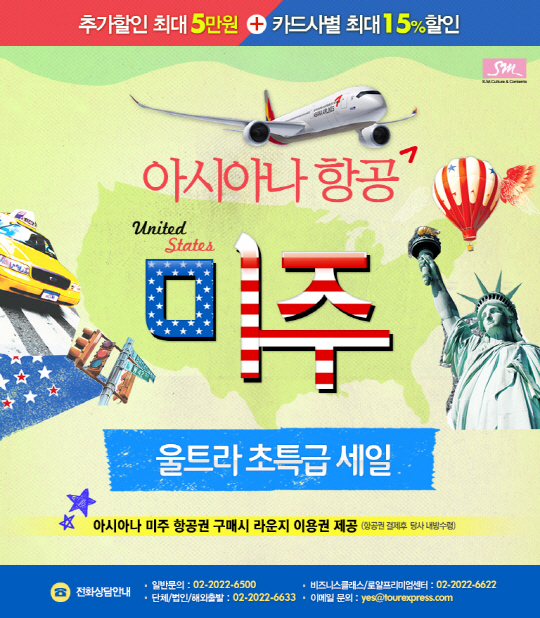 온라인 여행사 SM C&C 투어익스프레스(사장 송경애)가 겨울 해외여행 성수기를 맞아 아시아나항공 미주 초특급 세일 기획전을 선보인다.