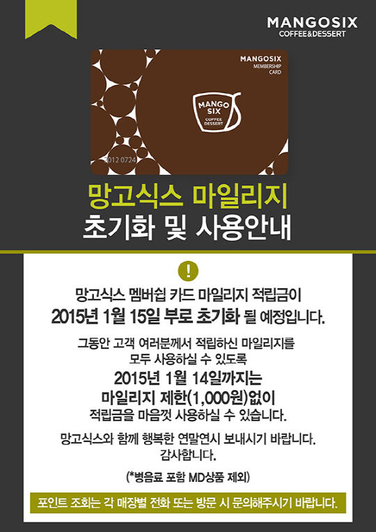 망고식스는 매장 사용금액의 2%를 마일리지로 적립하며 2014년 망고식스 멤버십 마일리지는 오는 1월 15일을 기준으로 모두 소멸되고 2월부터 새해 마일리지 정책으로 운영된다.