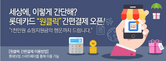 롯데카드는 지난 18일 '원클릭(One click) 간편결제' 서비스를 선보였다. 회원이 최초 1회 결제정보 등록 후 국내 인터넷, 모바일 쇼핑몰에서 회원 로그인만 하면 추가 인증없이 단 한번의 클릭으로 간편하게 결제할 수 있는 서비스다. 롯데닷컴의 기존 '스마트페이' 사용 고객은 별도의 등록 없이 바로 롯데카드의 원클릭 간편결제 서비스 이용이 가능해졌다. 스마트페이(Smart Pay)는 카드번호나 비밀번호 입력 없이 휴대폰 인증만으로 결제가 가능한 롯데닷컴의 간편결제 서비스다.