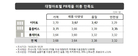 한편 대형마트별로 PB제품 이용 만족도를 4개 부문(가격, 제품 다양성, 품질, 안전성·5점 만점)으로 나눠 조사한 결과 이마트가 '제품다양성'(3.67점), '품질'(3.42점)에서, 홈플러스는 '가격'(3.71점), '안전성'(3.35점) 부문에서 상대적으로 높은 만족도를 보였다. 롯데마트는 4개 부문에서 1위를 차지한 것은 없었다.