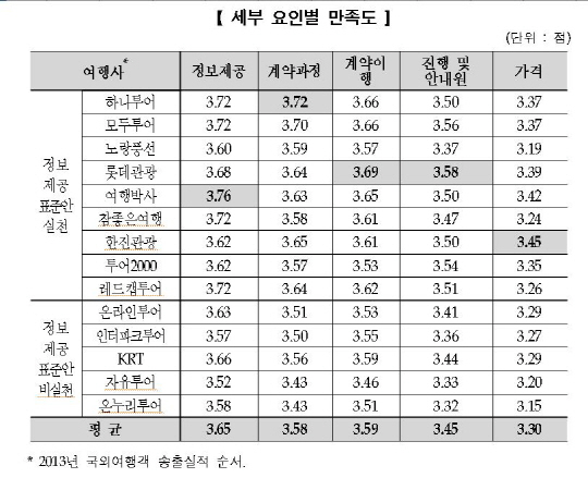 이는 한국소비자원이 해외 패키지여행 상품을 판매하는 국내 14개 종합여행사(한국여행업협회 2013년 송출실적 상위업체 기준)에 대한 소비자 만족도를 조사한 결과다.