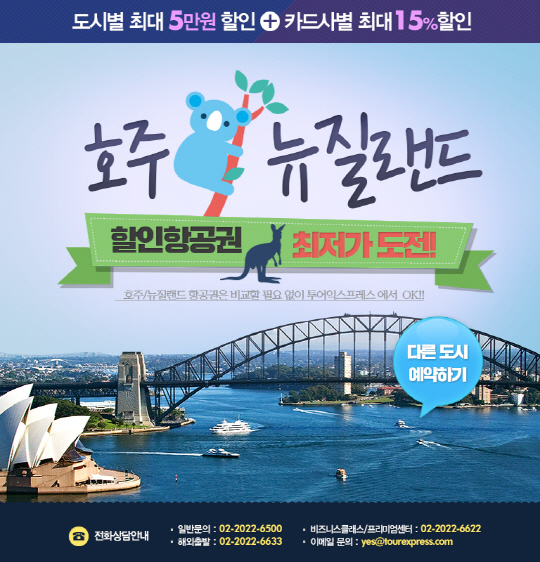 한편, 투어익스프레스의 호주, 뉴질랜드 항공권 예약 서비스는 홈페이지(www.tourexpress.com)에서 가능하다.