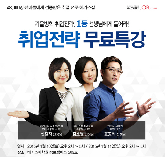 해커스잡이 2015년 상반기 공채 대비 '겨울방학 취업전략 1등 선생님에게 듣는다!' 취업설명회를 진행한다. 사진제공=해커스잡