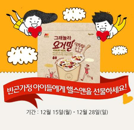 애경 '헬스앤'은 28일까지 AK LOVER 홈페이지(www.aklover.co.kr)에서 소비자 참여형 나눔 이벤트를 진행한다. 빈곤가정 아동에게 응원메시지를 작성한 이벤트 참여자 중 추첨을 통해 100명을 뽑아 그래놀라 요거밀 1박스을 증정하고, 당첨자 1명 당 3곳의 빈곤가정에 제품 1박스(총300박스)를 당첨자 이름으로 응원메시지와 함께 전달한다.