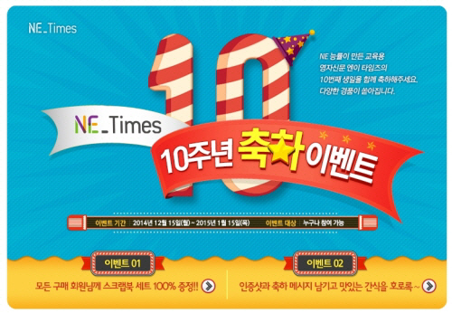 교육서비스 전문기업 NE 능률(능률교육, 대표 황도순)의 학습용 영자신문 '엔이 타임즈'가 발간 10주년을 맞아 내년 1월 15일까지 'NE Times 10주년 축하 이벤트'를 진행한다.