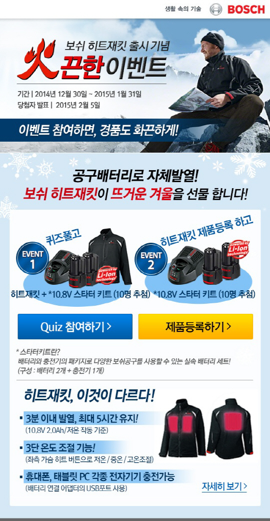 '보쉬 히트재킷'에 대한 간단한 문제를 맞추는 '히트재킷 퀴즈 이벤트'는 제품 구매여부와 관계없이 모두 참여 가능하다. 이벤트 종료 후 정답자 중 최종 10명을 선정해 '보쉬 히트재킷' 베어툴(본체)과 제품에 사용되는 '10.8V 스타터 키트'(10.8V 2.0Ah 배터리 2개, 충전기로 구성)를 세트로 증정할 예정이다.