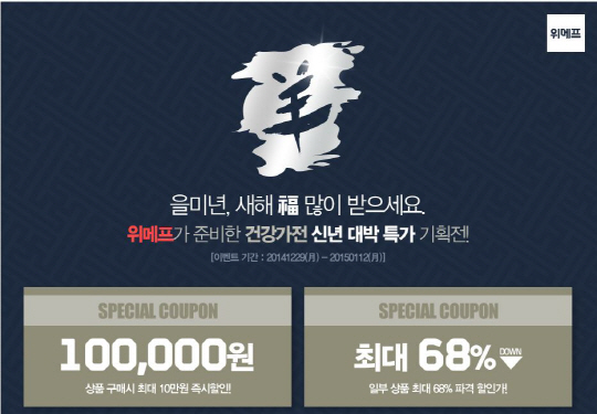 소셜커머스 위메프(대표 박은상 www.wemakeprice.com)가 새해를 맞아 내년 1월 12일까지 건강가전 기획전을 개최한다.