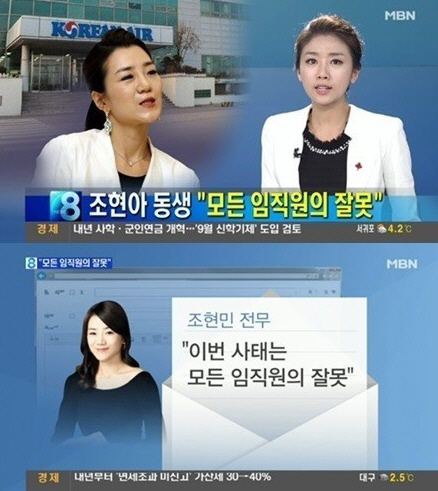 한편 조현민 전무는 지난 17일 대한항공 50여 명의 부서 직원들에게 보낸 '반성문'이라는 제목의 이메일에서 "(수직적인) 조직 문화나 지금까지 회사의 잘못된 부분들은 한 사람에 의해서만 만들어지지 않는다"며 "모든 임직원의 잘못"이라고 주장하면서 "그래서 나부터 반성한다"라고 전했다.