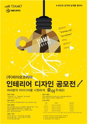 2월 16일부터 17일까지 이틀간의 심사를 거쳐 24일 당선작이 발표된다. 공모전 관련 세부 응모 사항은 홈페이지(www.ti-amo.co.kr)에서 확인할 수 있다. 띠아모코리아 관계자는 "뉴 브랜드 론칭과 함께 전반적인 브랜드 고급화에 힘쓸 예정"이라며 "인테리어 디자인 공모전은 이러한 일환으로 기획됐다"고말했다. 공모전은 '띠아모커피'나 '카페띠아모' 브랜드에 관심있는 사람이라면 누구나 참여가 가능하다. 카페 인테리어에 대한 감각적이고 참신한 내용으로 규칙이나 제한도 없다.