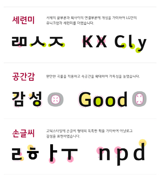 LG스마트체는 끝부분과 획 사이 연결부분에 곡선을 활용, 손글씨 형태의 감성을 살린게 특징이다.