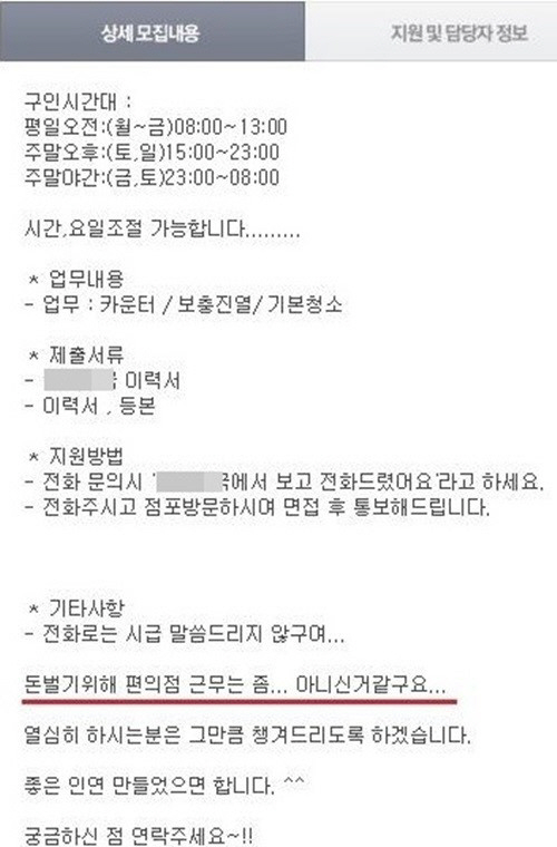논란이 되는 점은 임금에 대해 언급한 부분. 구인 게시물을 올린 이는 기타사항에 "전화로는 시급을 말씀드리지 않는다. 돈 벌기 위해 편의점 근무를 하는 것은 아닌 것 같다. 열심히 한 만큼 챙겨드리겠다"고 적었다.