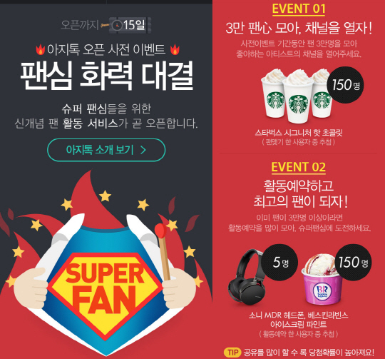 두번째 이벤트 '활동예약하고 최고의 팬심이 되자'는 최다 활동 멤버를 확보한 1등 채널의 활동예약자들 중 추첨을 통해 소니 MDR 헤드폰(5명), 배스킨라빈스 파인트 아이스크림(총 150명)을 제공한다.