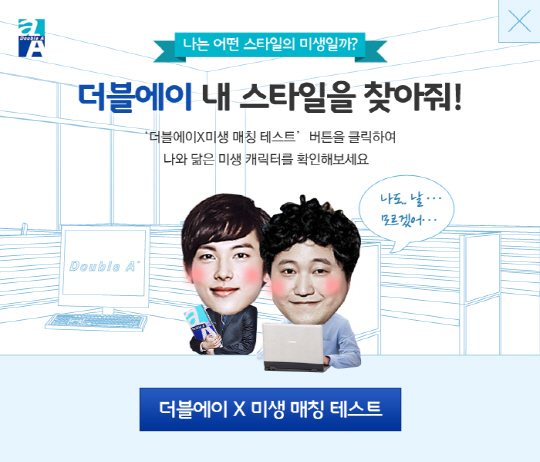 이번 이벤트는 2월 20일까지 진행하며, 참여를 원하는 사람은 더블에이코리아 공식 페이스북(https://www.facebook.com/DoubleA.Korea) 이벤트 페이지에 방문해 5문항의 간단한 심리테스트를 완료하면 된다. 나의 성격과 비슷한 '미생' 캐릭터를 알아보고, 캐릭터에 적합한 더블에이 제품을 추천 받을 수 있다.
