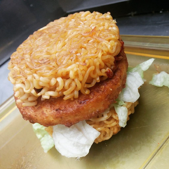 롯데리아 라면버거는 삶은 라면을 구워 부드러운 식감을 강조한 제품으로 라면 특유의 맵고얼큰한 맛을 나타내기 위해 할라페뇨 소스를 토핑해 닭가슴살 치킨 패티와 어울린 불닭 컨셉을 활용한 이색 제품이다.
