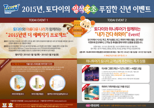 '2015년 더 예뻐지기 프로젝트' 이벤트는 1월 한 달간 사전 예약을 하는 고객 중 추첨을 통해 매주 2명에게 아름다운나라 피부과에서 만든 화장품 VIP세트를 증정하는 이벤트다. 또한 온라인을 통해 토다이 페이스북에 해당 이벤트를 공유하는 이벤트와 토다이 맘스카페에 자신의 예뻐지는 시크릿 이벤트도 진행해 화장품 VIP세트와 식사권 등 다양한 상품을 증정한다.