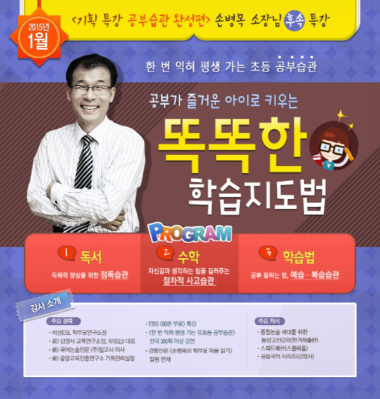 이번 특강은 학부모 포털사이트 '부모2.0'의 전 대표이자, 현재 '비상ESL 학부모연구소'를 총괄하고 있는 자녀교육 전문가 손병목 소장이 맡는다. 손 소장은 지난해 11월 '공부습관 화내지 않고 길러주기' 특강에 이어, 공부가 즐거운 아이로 키우기 위한 '공부습관의 완성 편'으로 이번 특강을 준비했다. 특강에선 '독해력 향상을 위한 정독 습관', '수학의 자신감과 생각하는 힘을 길러주는 절차적 사고 습관', '공부 잘 하는 예습·복습 습관' 등을 주제로 한 번 익혀두면 평생 지속되는 초등 공부습관을 가정에서 효과적으로 지도하는 방법을 소개할 예정이다.
