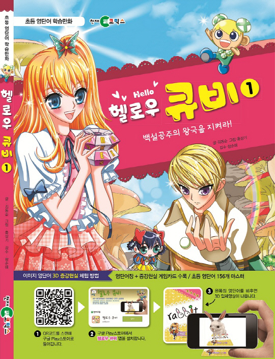 '헬로우 큐비 1권'은 영어 학습의 기본인 어휘력 향상을 돕기 위해 초등 권장 영단어 156개를 수록했다. 많은 단어를 외우는 것보다 오래 기억하는 것이 더 중요하다는 점에 착안해 '이미지 연상 암기법'을 도입한 게 특징이다. 특히 명작 동화를 새로운 시각으로 재구성한 흥미로운 스토리 속에서 자연스럽게 영단어를 학습할 수 있도록 한 점이 눈에 띈다. 만화 속 대사에 영단어를 노출시켰으며 각 페이지 하단에 단어의 의미를 그림으로 표현한 '이미지 영단어'를 배치해 영어 철자를 반복적으로 읽을 수 있도록 했다.