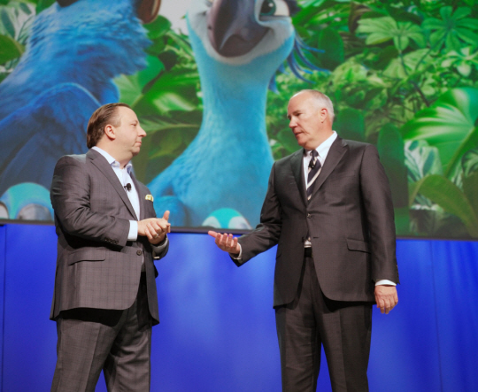삼성전자 미국법인 조 스틴지아노 상무(왼쪽)와 20세기폭스 홈엔터테인먼트 부문의 마이크던 사장이 'UHD 얼라이언스'를 소개하고 있다.