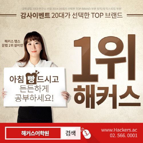 한편 해커스어학원은 지난 11월 21일 대학내일 20대 연구소에서 발표한 '2014년 20대에게 사랑받은 15개 브랜드-토익/토익스피킹 학원 분야 Top Brand 1위'에 선정돼 최신 트랜드에 발빠르게 따라가는 신뢰받는 브랜드임을 보여줬다. 해당 결과는 20대 3,412명을 대상으로 실시한 조사 결과로 구매경험, 선호도, 재구매 의향/추천의향 등 모든 평가지수에서 1위(300.0p)를 차지해 주목받고 있다.